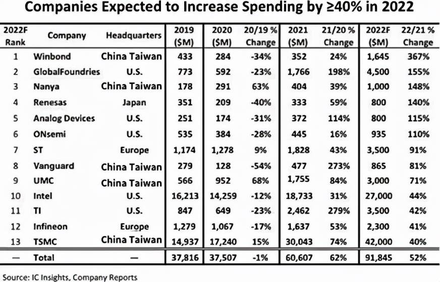 上圖中13家公司的總支出預(yù)計將是兩年前2020年的近2.5倍。支出的大幅度增長,主要是由于當前市場激增的需求導(dǎo)致的供不應(yīng)求,未來隨著需求的逐步被滿足,未來半導(dǎo)體公司的支出根據(jù)銷售情況會進行調(diào)整。